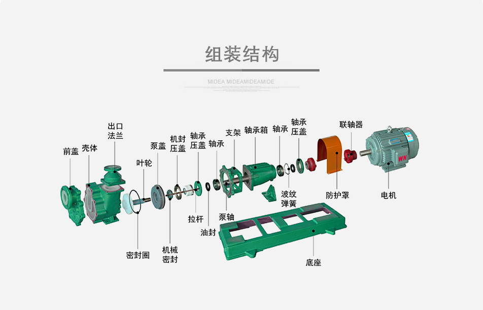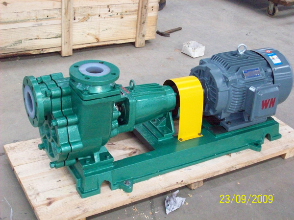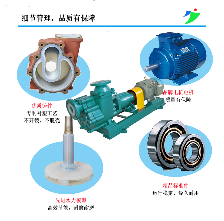 部件全部采用氟塑料合金制造,泵盖、叶轮等均用金属嵌件外包氟塑料整体烧结压制而成,轴封采用外装式