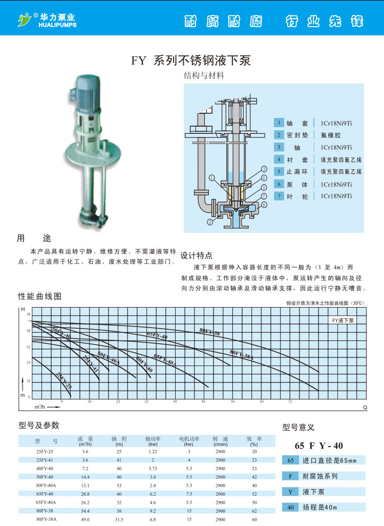 耐腐蚀液下泵系立式单级单吸液下离心泵,用于输送不含固体颗粒、悬浮物及易结晶的腐蚀怀液体。输送介质温度(~30℃~110℃)具体查触液材料表,本系列氟塑料液下泵的流量范围为3.6~216米3/时,扬程自8~50米;转速为2900转/分。